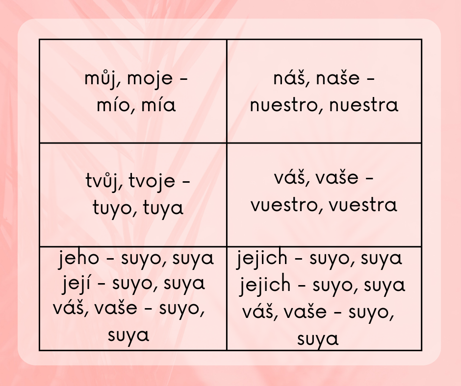 Nejdříve si probereme přivlastňovací zájmena nesamostatná. To jsou ta, která stojí před podstatným nebo přídavným jménem. Např: Mi coche - moje auto; Su hijo - jeho syn apod.